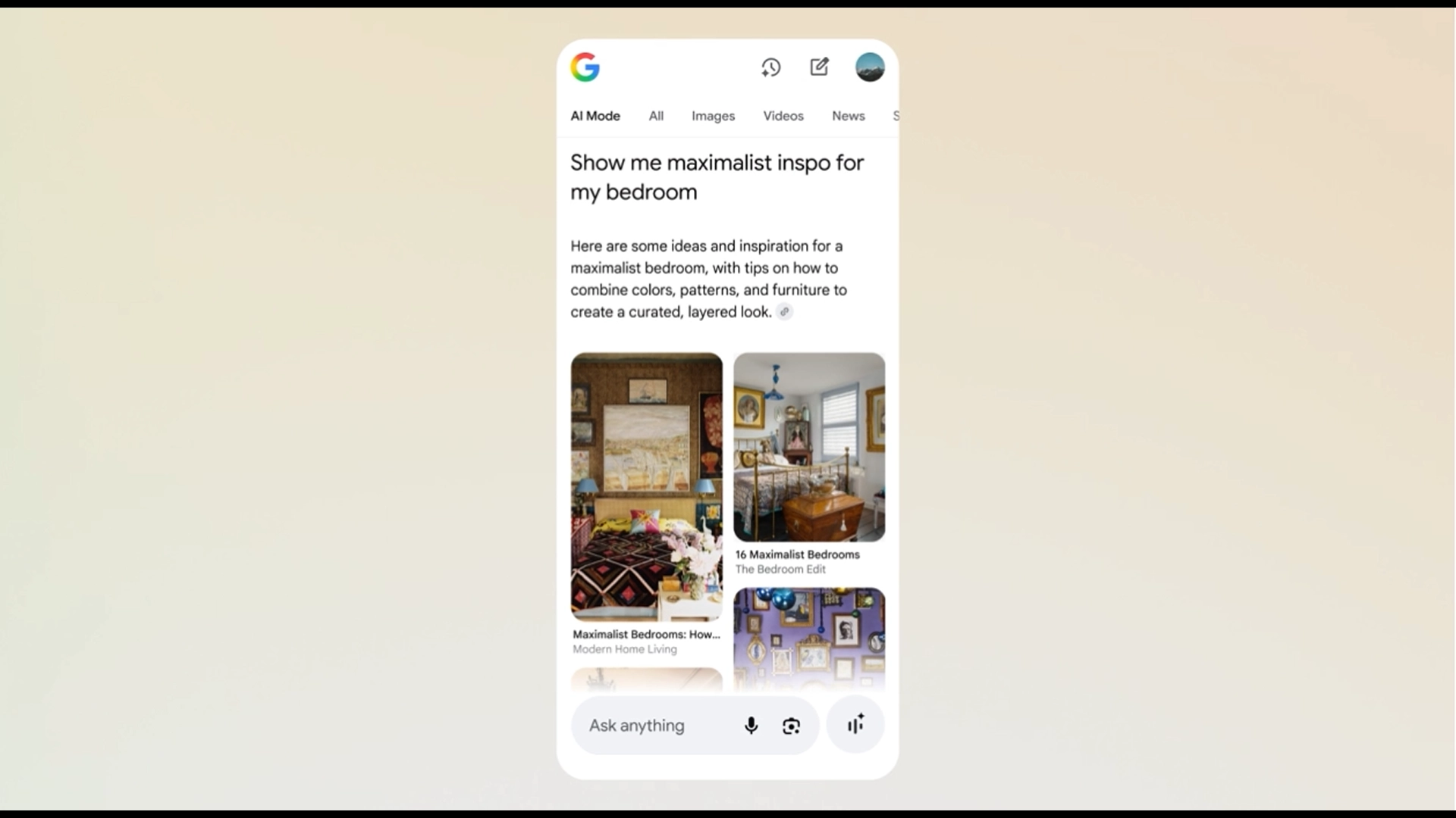 For instance, you might see someone on the street with an aesthetic you like, snap a picture, and ask AI Mode to “show me this style in lighter shades." Or you oculd ask for "retro 50s living room designs" and see what people were sitting on and around 75 years ago. Google pitches this feature as a way to replace filters and awkward keywords with natural conversation.