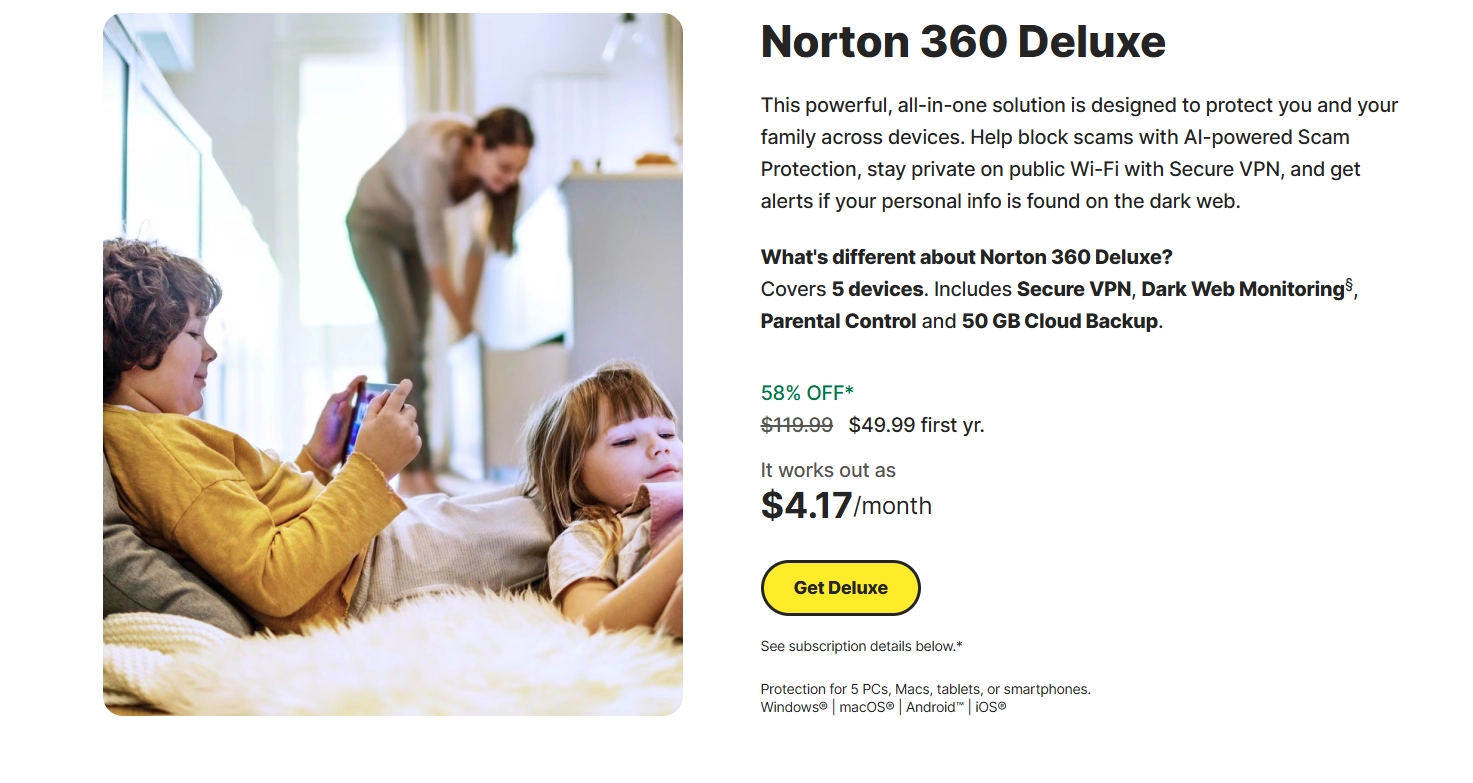As for the features that improve day-to-day life, Norton 360 Deluxe adds a 50GB cloud backup, dark web monitoring for compromised accounts, and parental controls to keep the household safe.