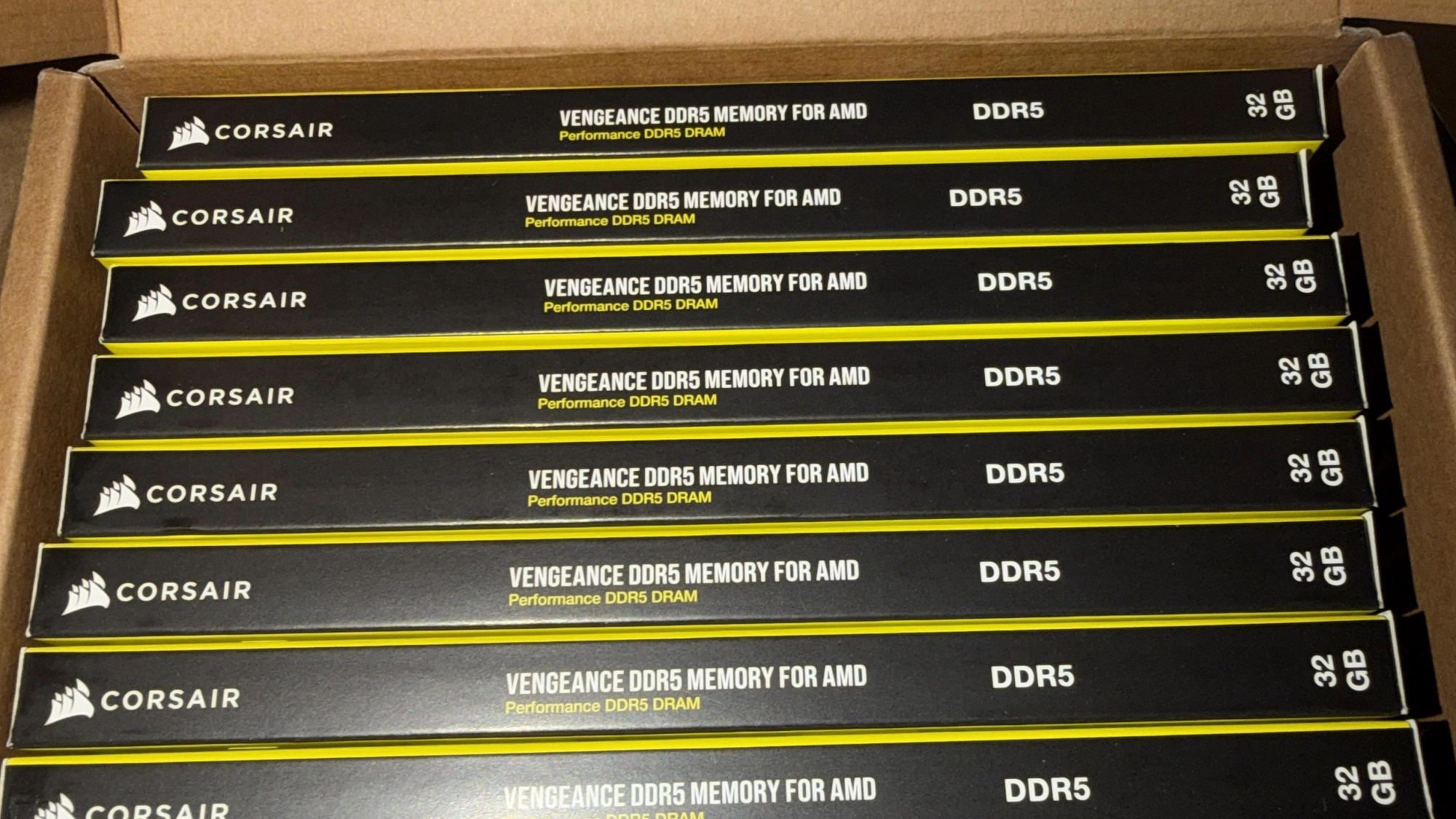 What they received, though, was a box of 10 of these 32GB kits, which of course is worth $3,000 — based on the price apparently paid, anyway, which seems cheap. (If we look at Newegg in the US right now, for example, the cheapest Corsair Vengeance DDR5 kits I can see are around $400, so this pile of RAM is actually selling for quite a bit more than three grand in theory).