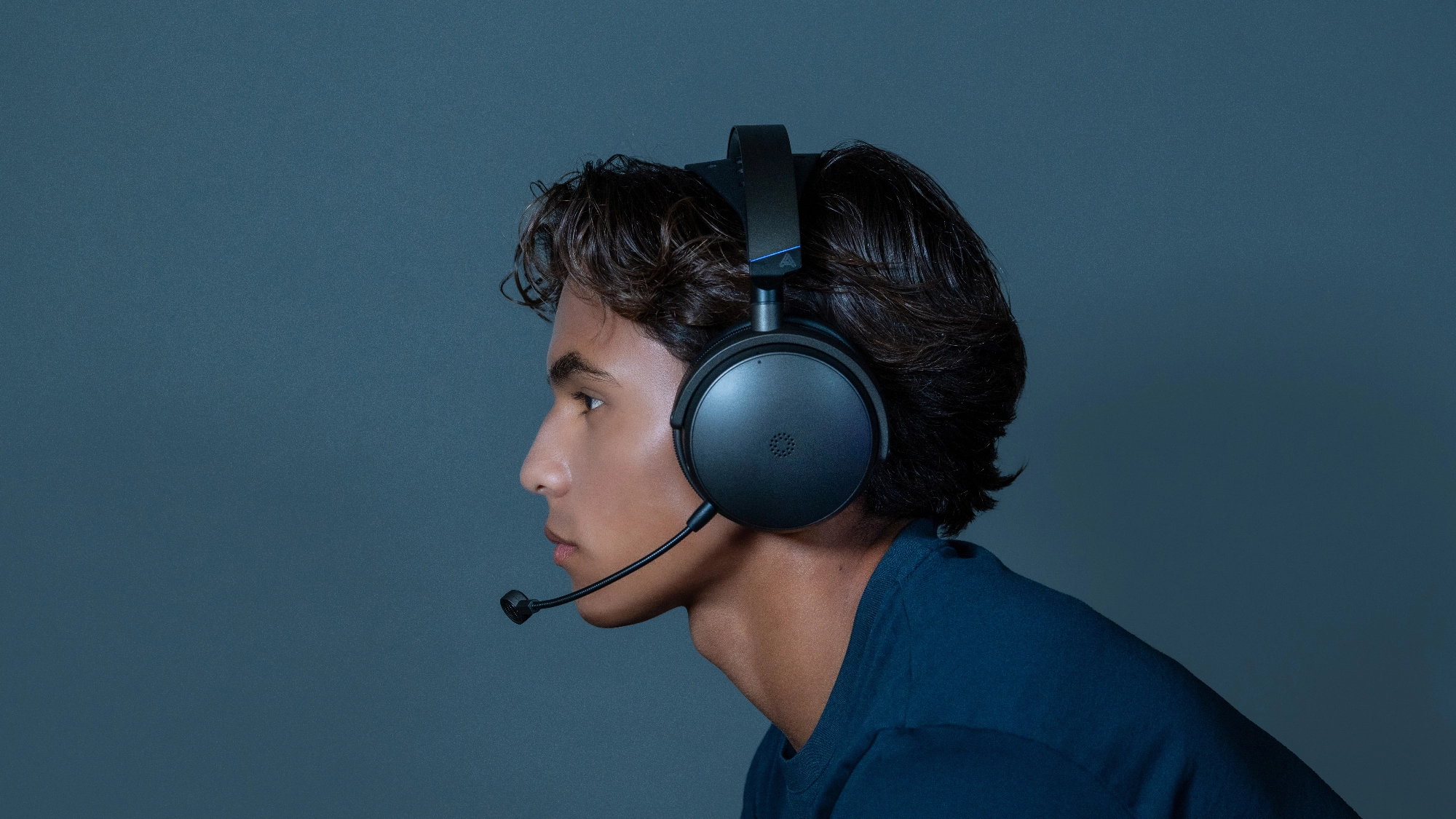 A man wearing the Maxwell 2 gaming headset from Audeze with the microphone extended, with the main looking to the left and the image showing the side of his face.