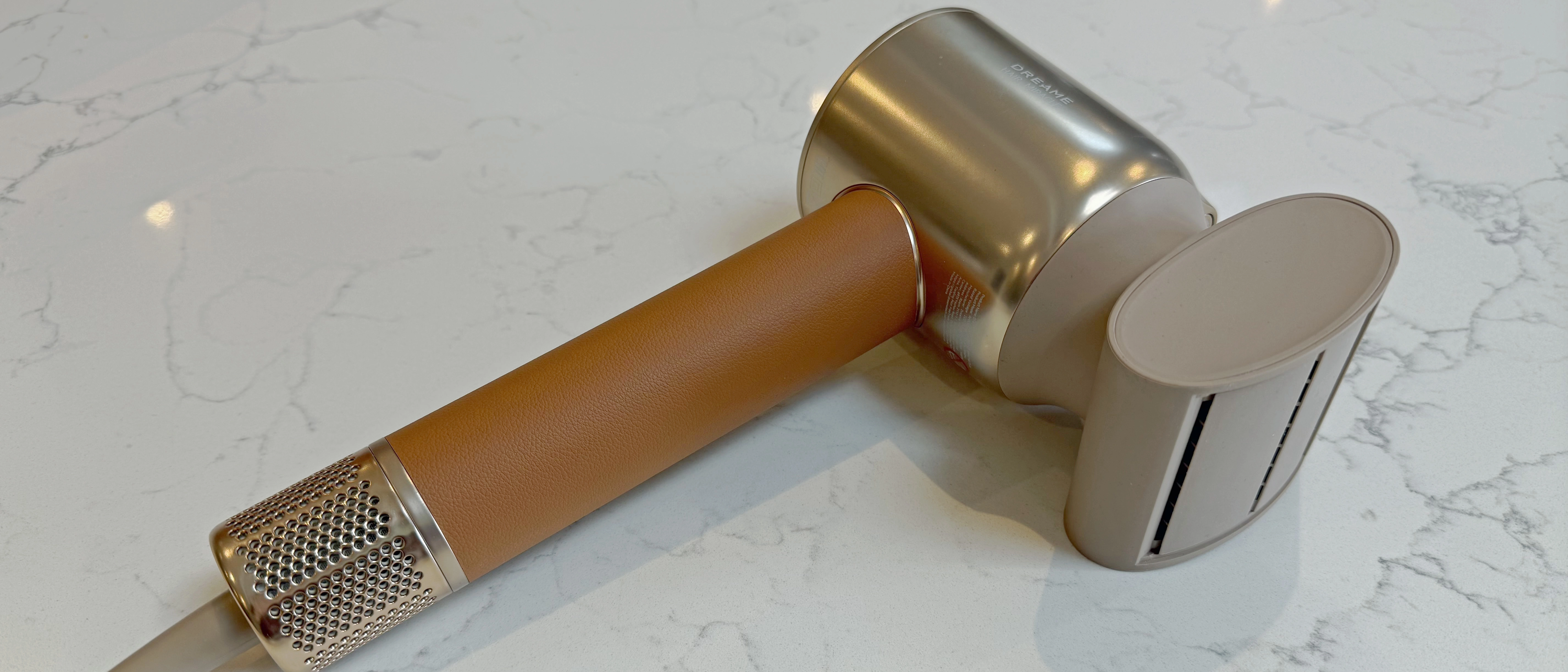 The Miracle Pro has the same barrel-over-handle shape as most has added a couple of features to make it look noticeably different. The handle is covered in textured faux leather, the barrel and attachments come in a matte gold, and the whole thing arrives in a velvet-lined box.