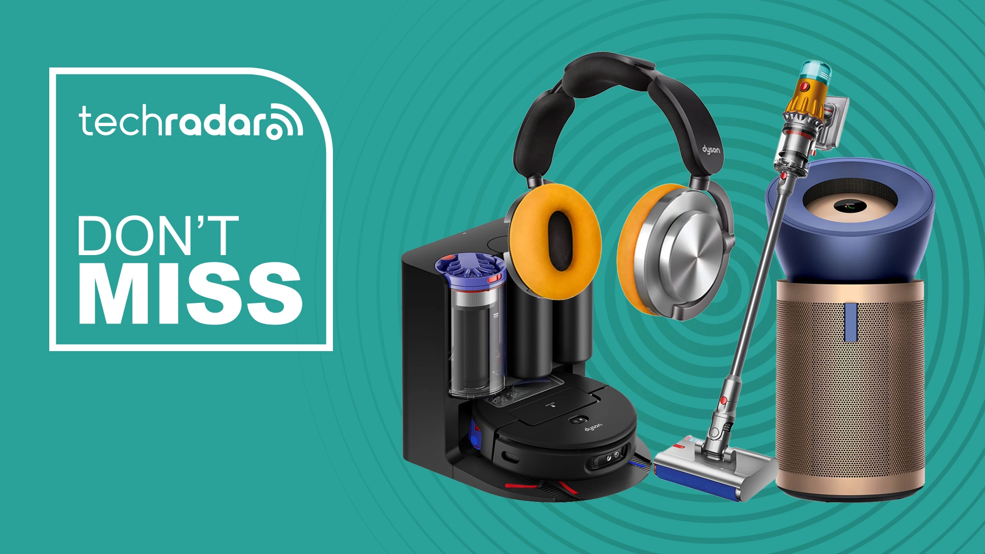 Dyson vacuum cleaners, headphones and air purifiers on a cyan background with "Don't Miss" text in white.