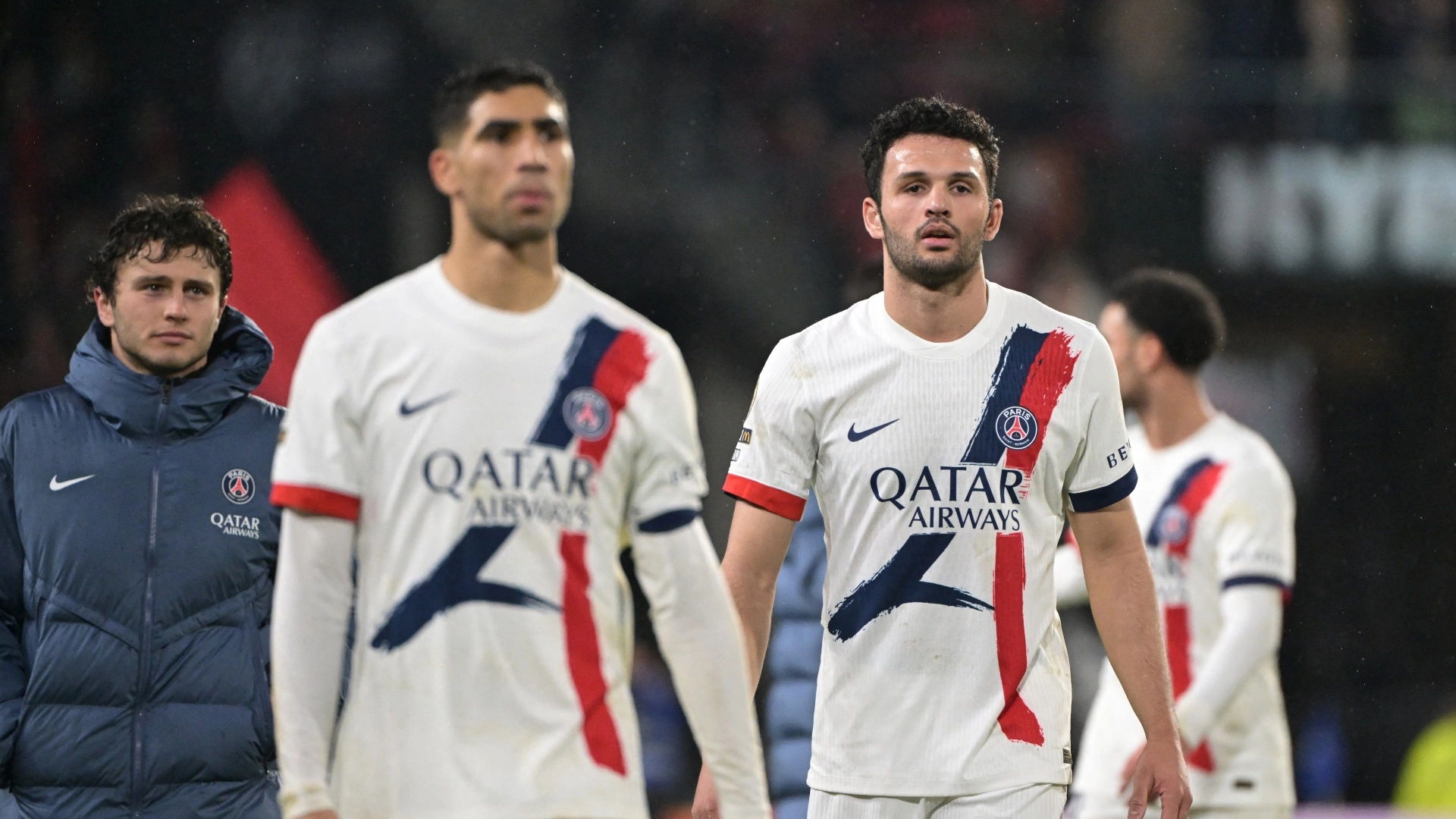 Achraf Hakimi and Goncalo Ramos looking dejected after a PSG defeat