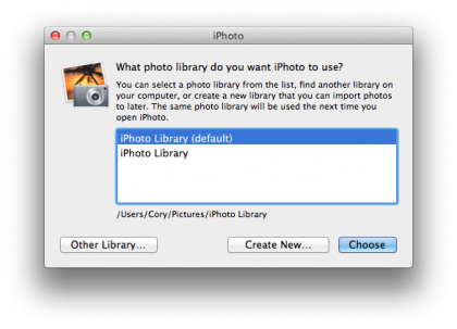 After the syncing ordeal, open the file in iPhoto by holding down the Option key as you launch the app. Choose the other library that's not the default to make it so. Now, the iPhoto Library stored inside your Dropbox or Google Drive folders will be the default, and any changes you make will automatically sync into the cloud with each save.