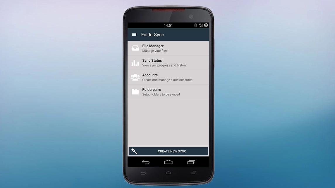 From the FolderSync home screen, you can quickly add a 'folderpair' (that is, set one folder on your Android device to sync with a folder in your cloud storage provider) with some default options by pressing the 'create new sync' button down the bottom, and following the step-by-step wizard. You can set an optional schedule using this wizard, too, which can then be edited later – along with a host of other options – from the 'Folderpairs' section.