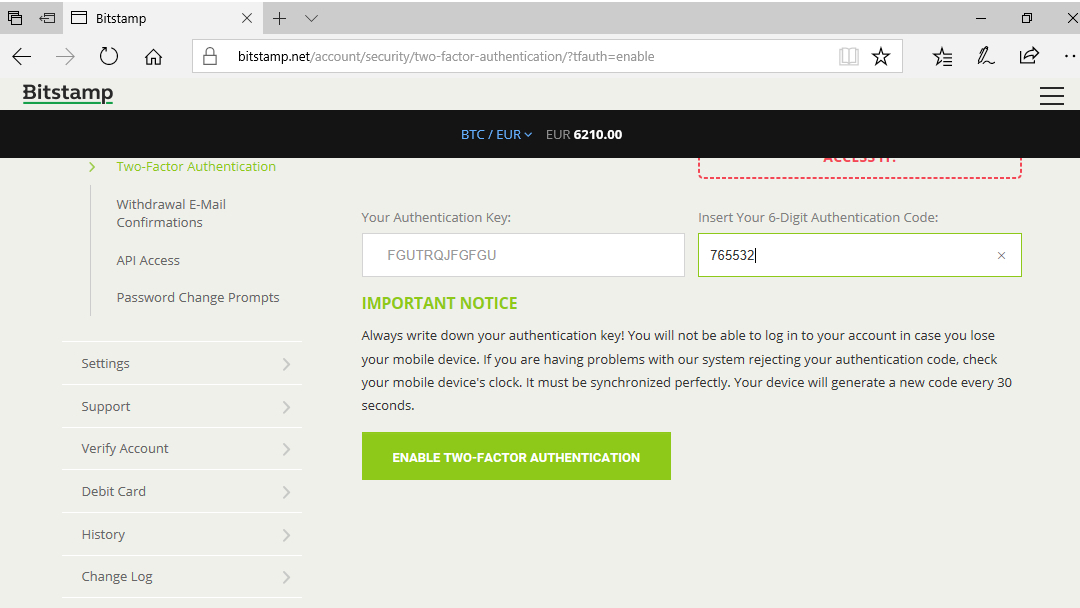 Enabling two-factor authentication means Bitstamp will request a special code from your mobile device when signing in or processing transactions. To use it, you'll need a suitable app for your phone such as Google Authenticator or FreeOTP, which are free to download on the iTunes and Google Play stores (for iOS and Android respectively).