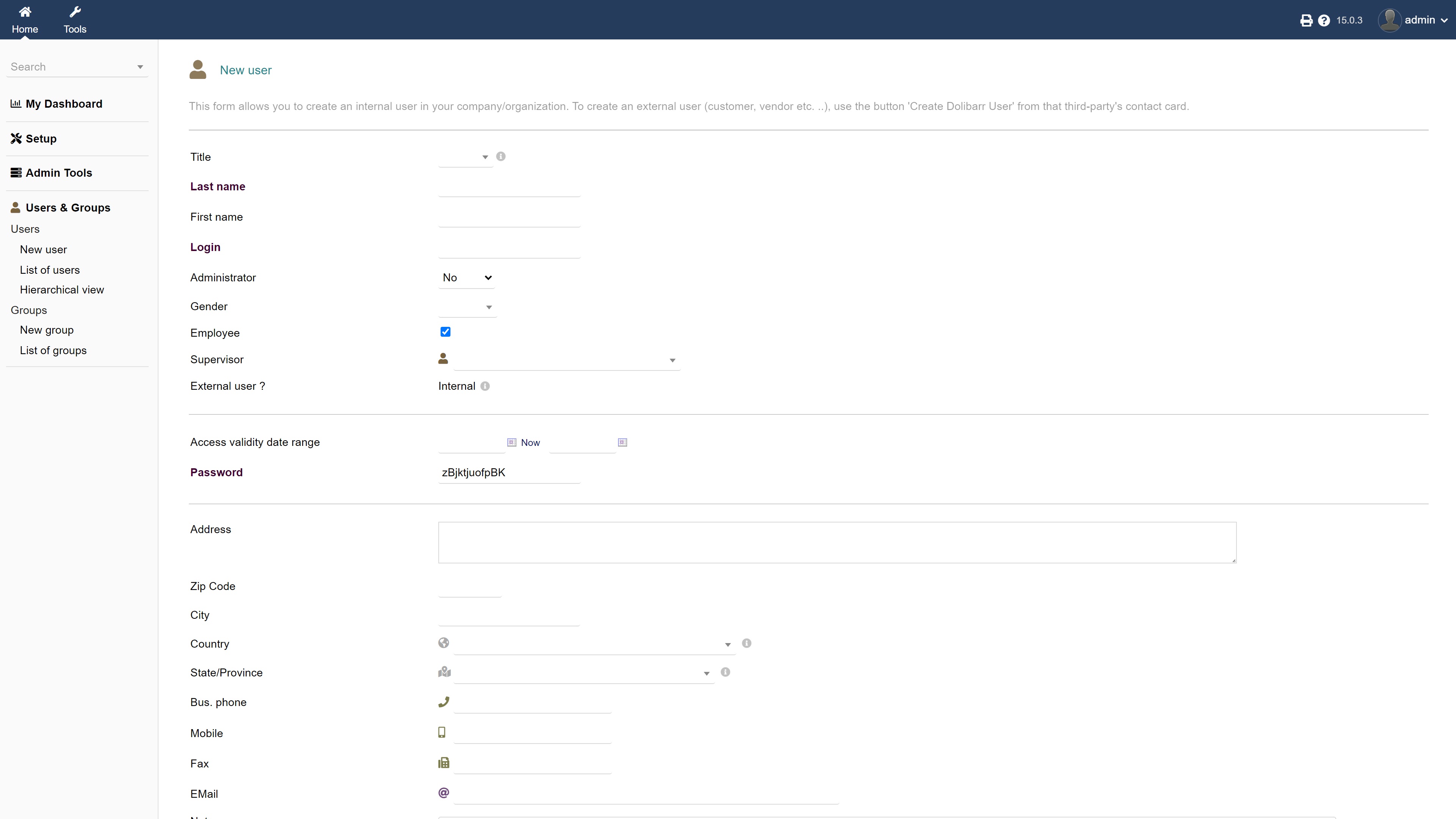 By now, your Dolibarr software should be pretty well set up. To add new user profiles head to Users & Groups > Users > New User. Here, you can provide information about each user, their position, and whether or not they’re a company employee.