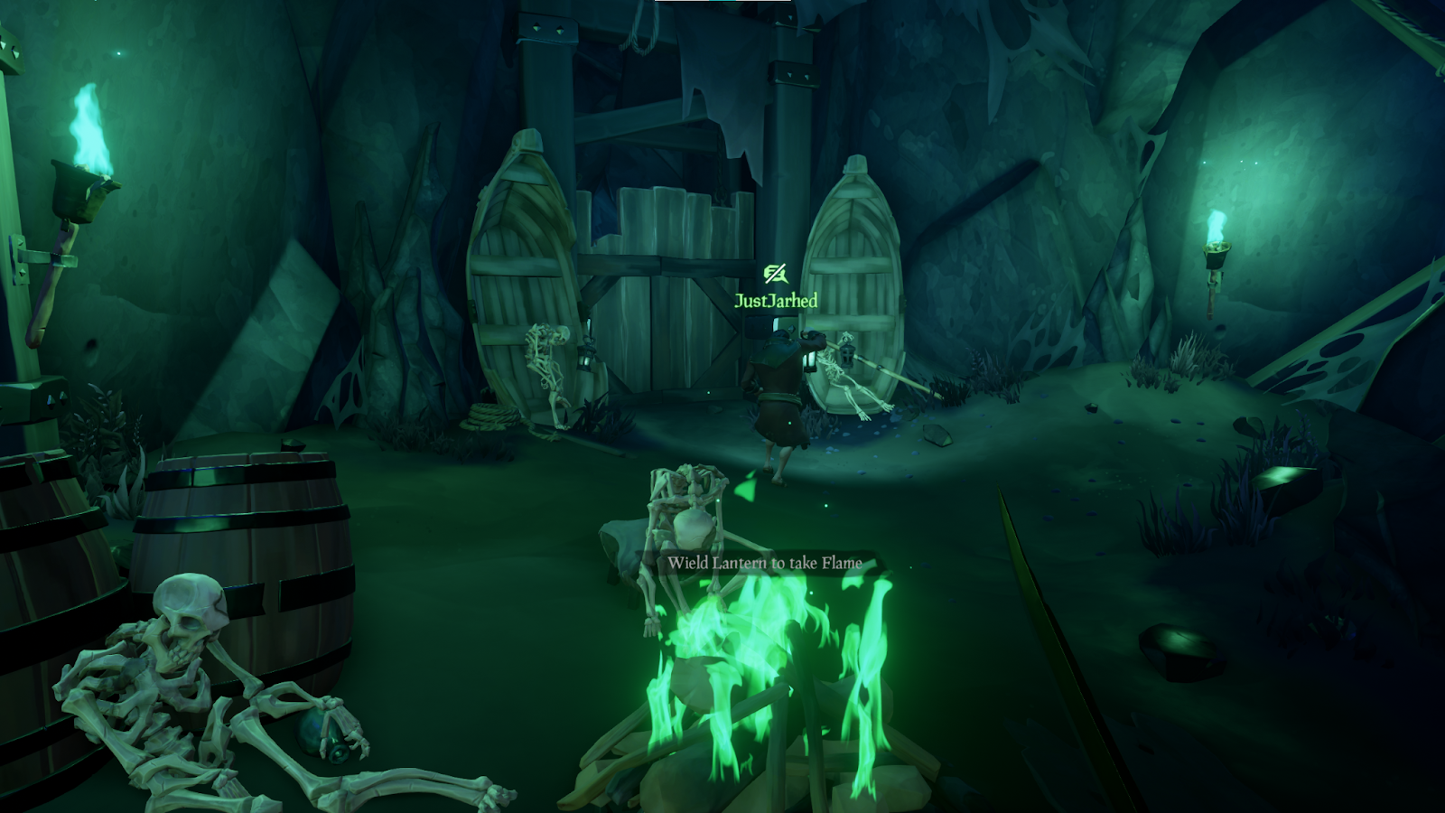 Proceed through and light the lantern hanging on the captain, then move the skeleton’s arm leaning against the wall to get to the second lantern. In a side pathway within this room, there’s a broken rowboat with another lantern. Once you light that one, the door will be opened by ghosts turning an anchor.