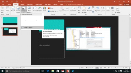 PowerPoint includes two powerful ways to project your message if you're working with software. First up you can use its screenshot tool to quickly capture screen regions or whole windows and pull them straight into your slides. Go to Insert > Screenshot and either select the window you want to insert (resize your chosen window as appropriate before selecting it here) or use the screen clipping tool to import a specific region. PowerPoint will automatically duck out of the way if you use the latter option.