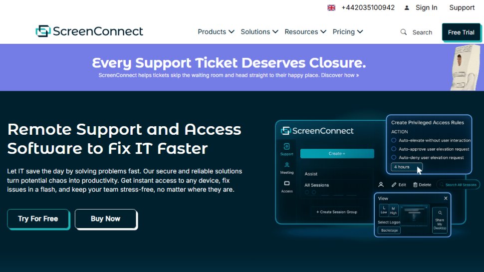 ConnectWise ScreenConnect, formerly known as ConnectWise Control, provides highly specialized remote access solutions targeted at specific users. Its three Support plans come with some remote access features, and include powerful tools to help IT staff and support technicians solve problems remotely. The Access plan allows for 25 devices and is aimed at those who want to connect with numerous remote devices.