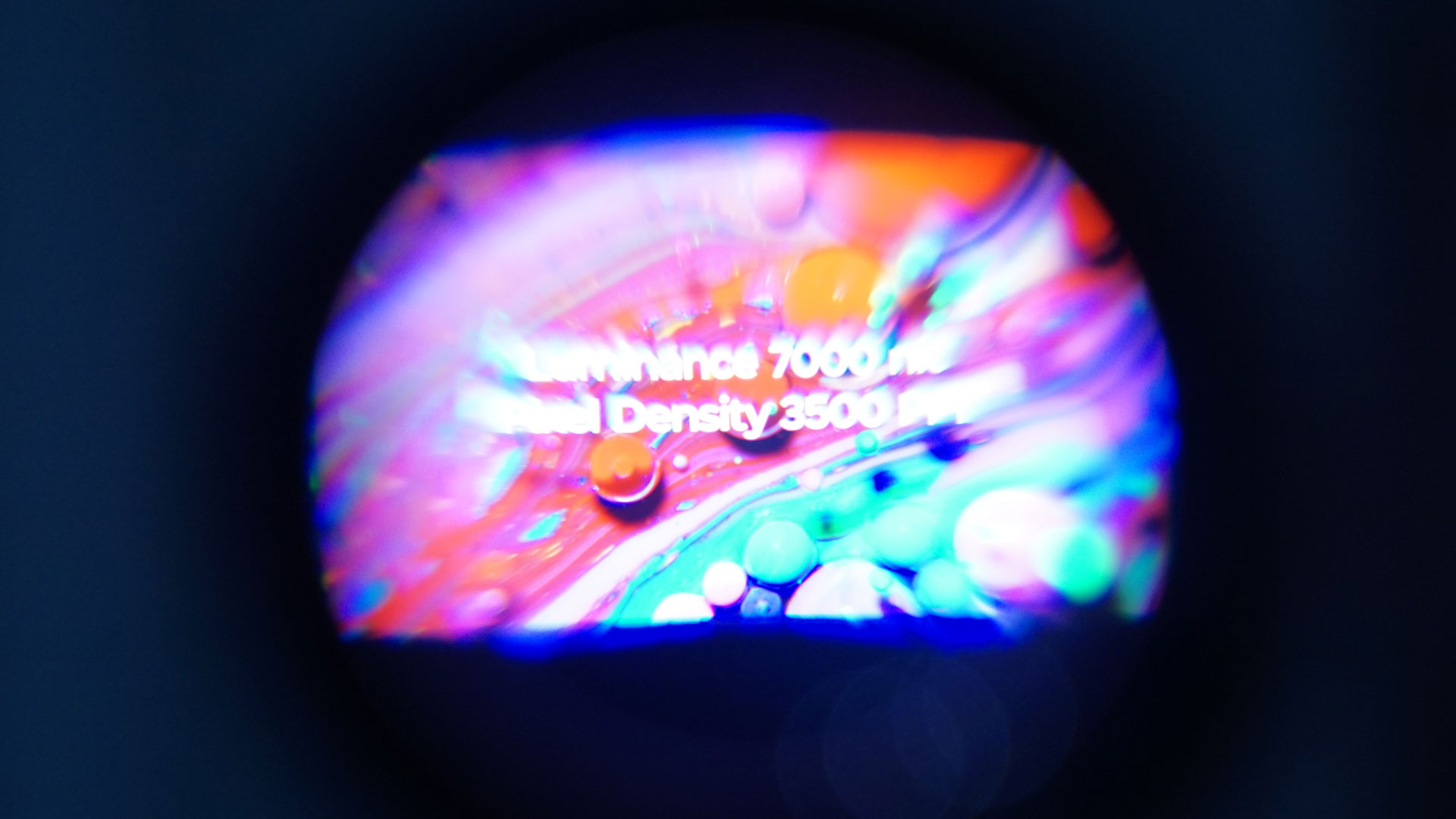 It's small enough that, from a distance of a few feet, I mistook it for a smudge on LG Display's white tour venue walls. But as I got closer, I noticed the smudge was moving. I could see that it was a tiny, 1024x768 screen. Next to the unadorned display, LG put one behind a loupe where I could get close and see the surprising level of detail LG Display packed into the small and shockingly bright screen (7,000 nits). The resolution measures out to 3,500 ppi (pixels per inch) and is further enhanced by a smooth 120Hz refresh rate.