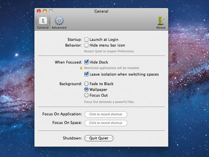 Launch Quiet: it will appear in the menu bar. Select Preferences and choose General. Check Hide Dock so the Dock hides during isolation. (Also, learn Command+Option+D for getting rid of the Dock at other times.) Select an option from Background, to define it when in isolation.