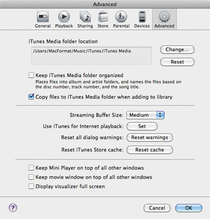 Start by selecting Preferences from the iTunes menu and moving to the Advanced tab. Check the Keep iTunes Media folder organized box and click OK. Now click the Change button and set a new location on your external drive for your library.