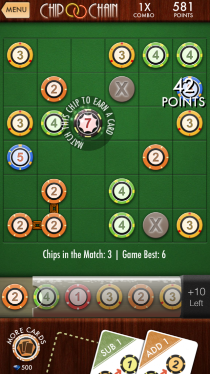 Blending the equally strong allures of match-three puzzlers and card games, Chip Chain (Free) smartly spices up the former approach by using the look and feel of the latter. You'll place colored and numbered chips on the game board and use the special cards that appear, all with the aim of matching up like chips and creating the titular chains to maximize points. Plenty fun for free!