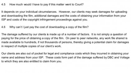 And in response to people asking why the settlement costs are more than just the cost of downloading the film, the script follows: "our clients are also out of pocket for legal and compliance costs [that] form part of the damage… to which they are also entitled to claim from you".