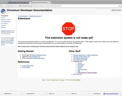 OFFPUTTING: The lack of extensions can put power users off, but there is an API (shown here in Chromium for the Mac) and Chrome will support them soon