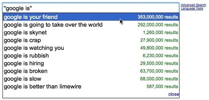 It's not just Google executives that seem to be protected from the awesome power of Google Suggest: Google itself appears to get away scot-free too. There's no doubt which answer Google wants you to take away from this one, as "Google is your friend" gets an incredible 353 million results. Google is your friend? All together now: they would say that, wouldn't they?