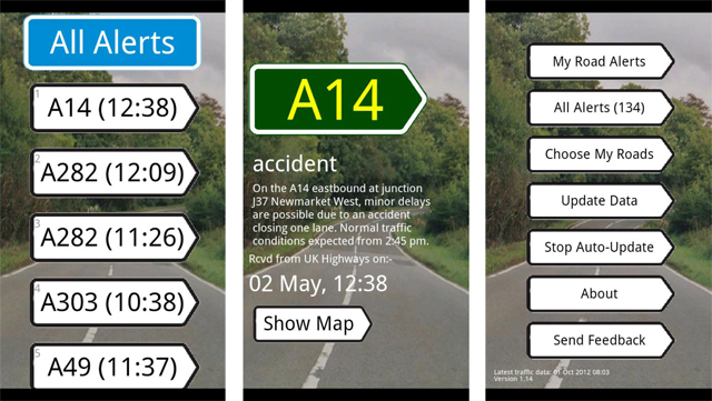 You can select the roads you will be driving along and see alerts for poor driving conditions, road closures or accidents ahead of you on your journey. Alerts appear as 'road signs' on the app's main page and you can select an alert to see more details and pinpoint it on Google Maps relative to your current location.