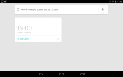 Where Now gets really cool is in its ability to recognise and act upon certain phrases and words. Say "Remind me to cook at six o'clock," for example, and Now automatically gives you a reminder. If you're using it on a phone, you can say "Call Andrew," and you'll be put through to the dialling screen.