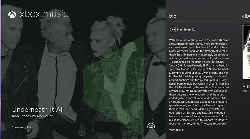 In use the bland background turns out not to be as drab as you'd expect. We like the way the monochrome grey background lets the artwork and artist photos stand out; these aren't the primary colours of the Windows 8 start screen.
