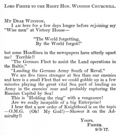 My dear Winston - The initialisation OMG, so beloved of the internet and teenage girls everywhere, was actually coined by this exclamation-mark-loving fella John Arbuthnot Fisher writing to Winston Churchill back in 1919. Seriously man, 10 exclamation marks in 100 words? And thus OMG's legacy was assured. [Letters of Note]