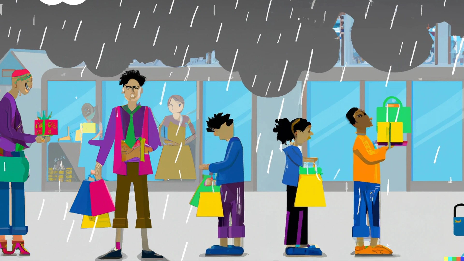 For this story, I input "A person shopping for Black Friday Deals but with an empty wallet and under bad weather. There are family members who want gifts. It should be a 1920 x 1080."
