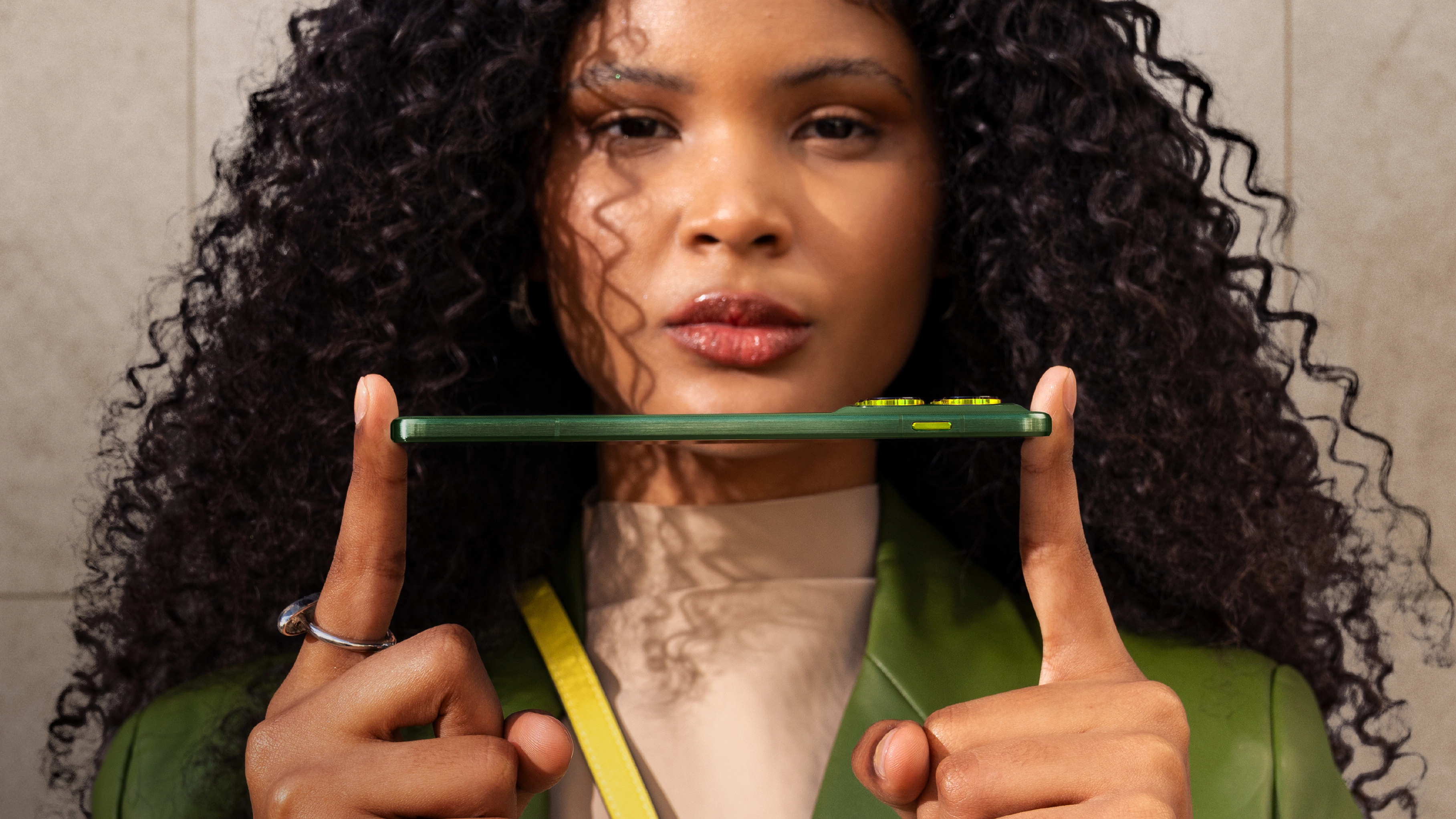 The phone is visually interesting, too, and available in three nylon-inspired finishes: Pantone Gadget Grey, Pantone Lily Pad, and Pantone Bronze Green.