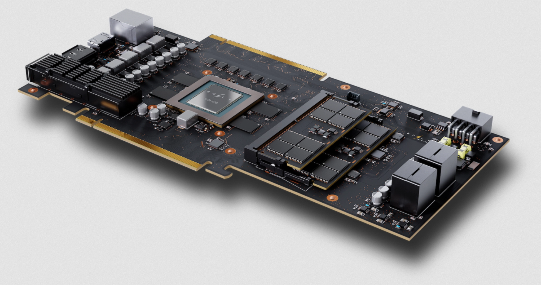 The prototype add in card uses a PCIe 5.0 x16 interface and pairs LPDDR5X graphics memory with DDR5 SODIMM slots for the RISC-V processor.