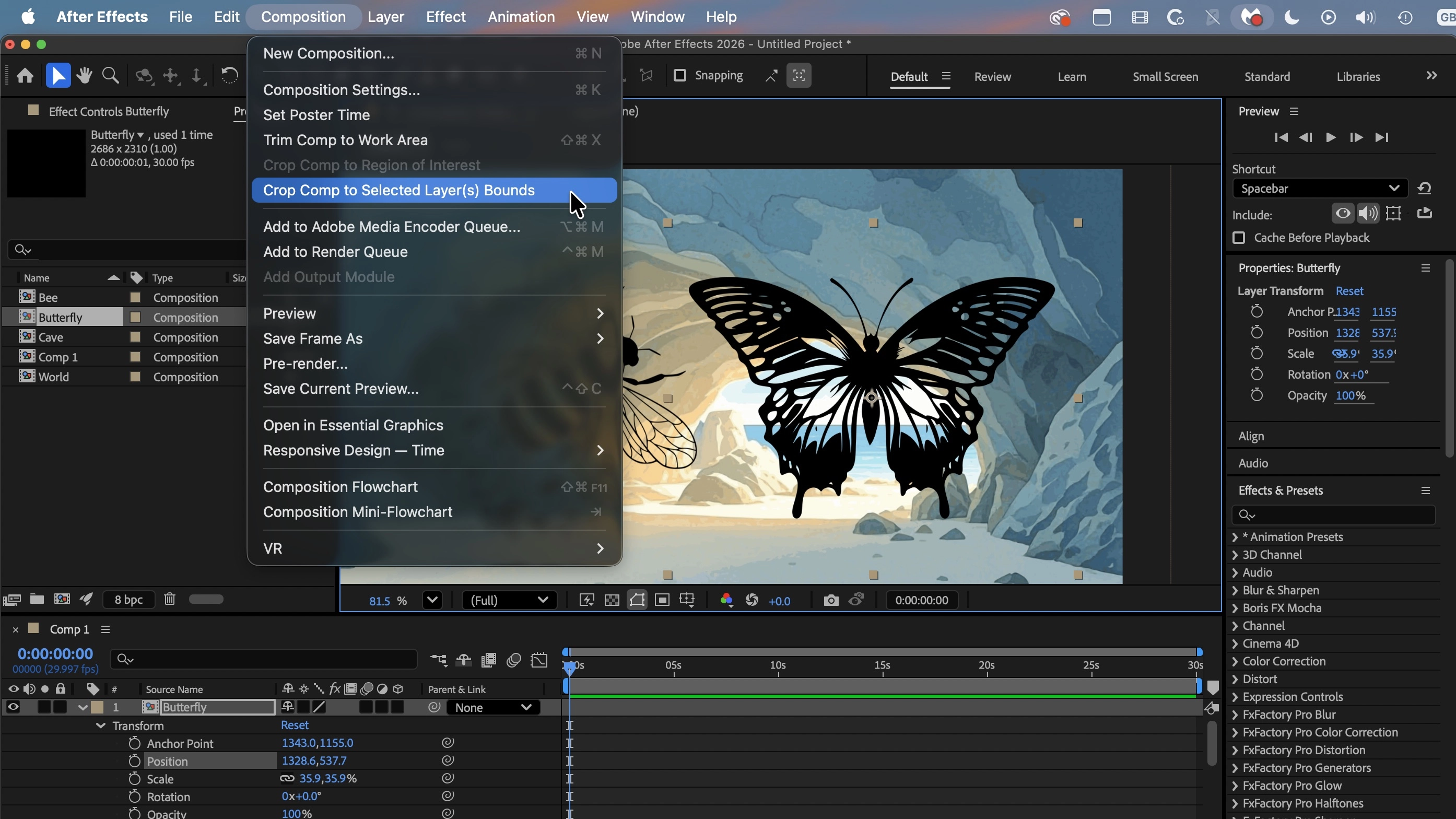 One feature I found particularly useful is the ability to crop your composition based on a selected asset. Associated with that is a feature I really liked: being able to work with SVG files natively, and even have access to, and being able to, manipulate every vector path that make up the selected illustration. The only downside is the mess that is the naming of the various paths and groups. Still, being able to modify each path over time is a fantastic feature for After Effects to have.