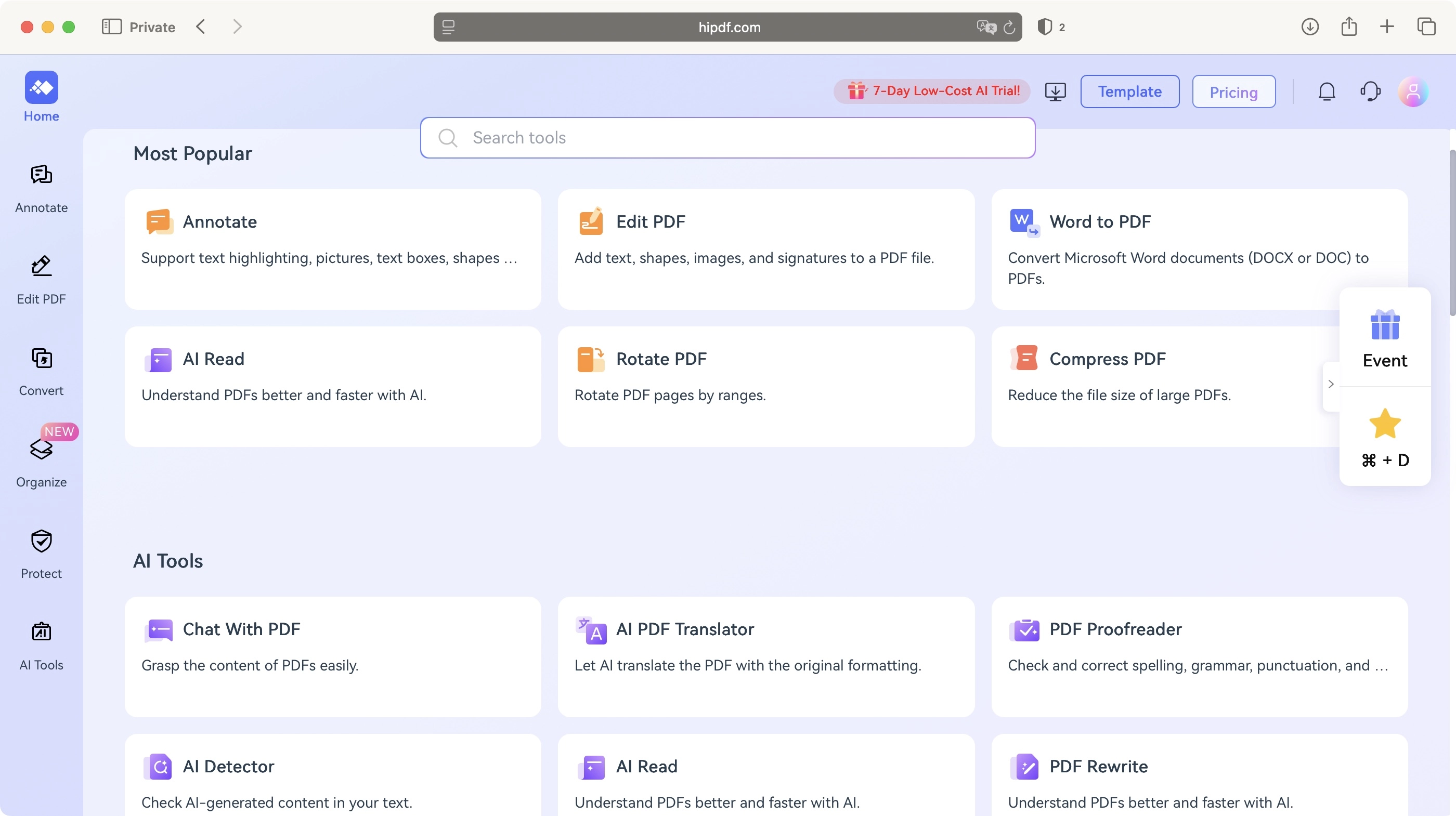 However, should your needs be more specific, the main part of the page is dedicated to all the tools HiPDF offers, organised by categories. You’ll see ‘Most Popular’ first, followed by ‘AI Tools’. All the features you’d come to expect from a PDF service are present and correct: Edit, Convert to and from a PDF format, Organise your file, and Protect it.