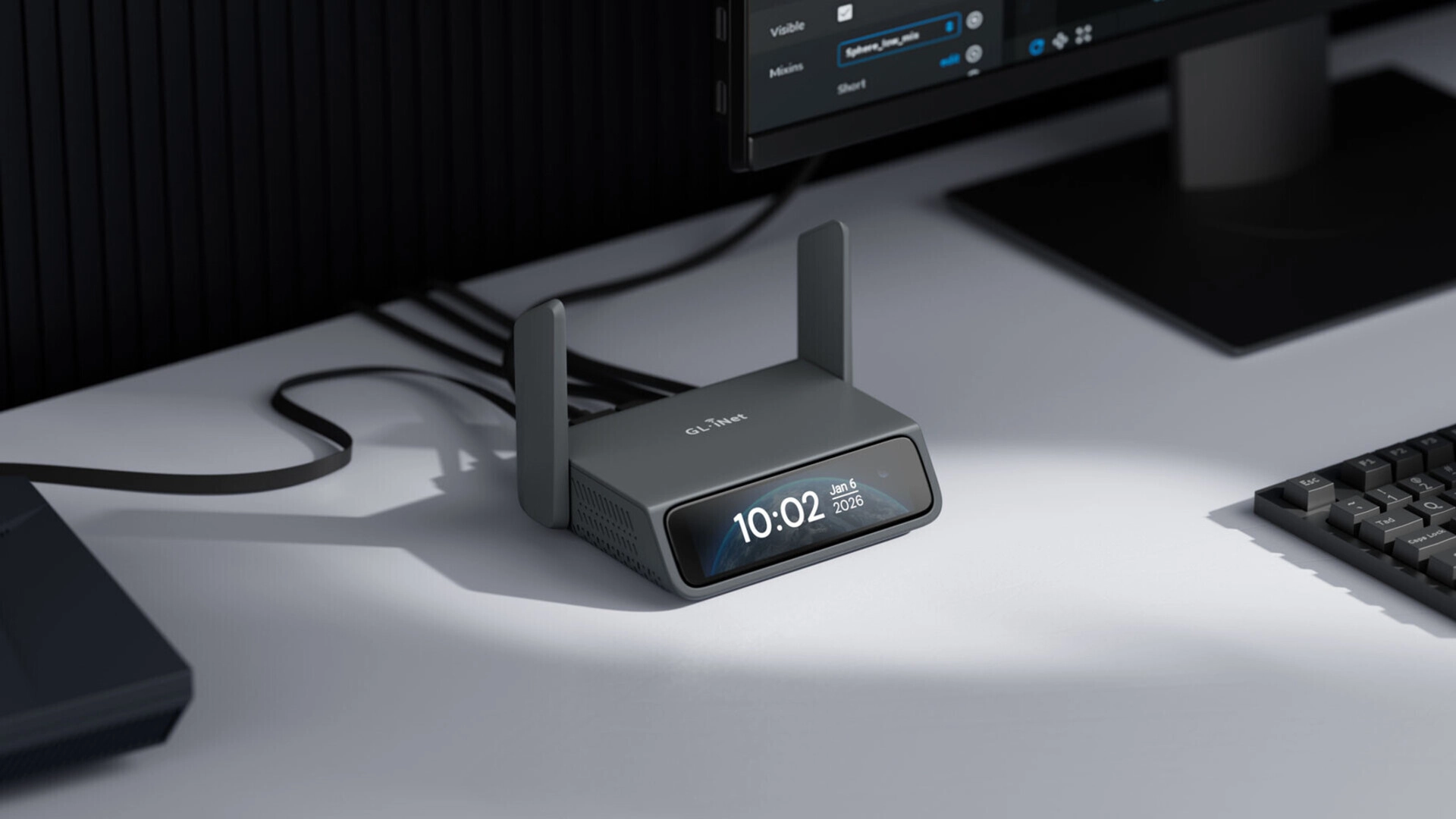 The touchscreen and dual Ethernet features echo designs seen in GL.iNet’s Slate 7 portable router, while the multi-network failover concept is refined from their Puli AX cellular router.