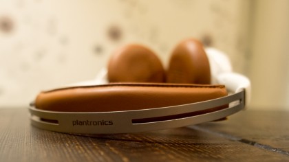 Plantronics really shows its stuff with the ear cups. On their outside, the cups are covered in smooth plastic and feature a svelte copper grille and rubber face buttons. Flipped over, their leatherette pads are cleverly perforated with "L" and "R" to illustrate how to put the headphones on correctly.
