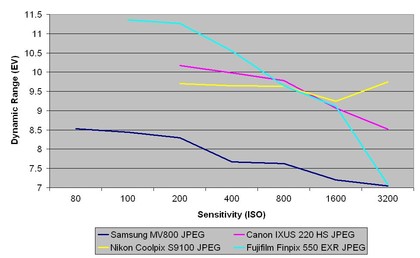 This chart indicates that the Samsung MV800's JPEGs have a consistently lower dynamic range result than the Canon IXUS 220 HS, Nikon Coolpix S9100 and Fujifilm Finepix 550 EXR, showing the shadow and highlight tone is easily lost.