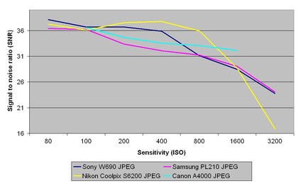 These results show that images from the Sony Cyber-Shot W690 at lower ISO sensitivities show the same sort of signal to noise ratio as those from the Samsung PL210, Nikon Coolpix S6200 and Canon A4000. At mid-range sensitivities (between ISO 100 and ISO 400), the Sony camera performs better than all but the Nikon, before dipping at higher ISOs to the Samsung's level.