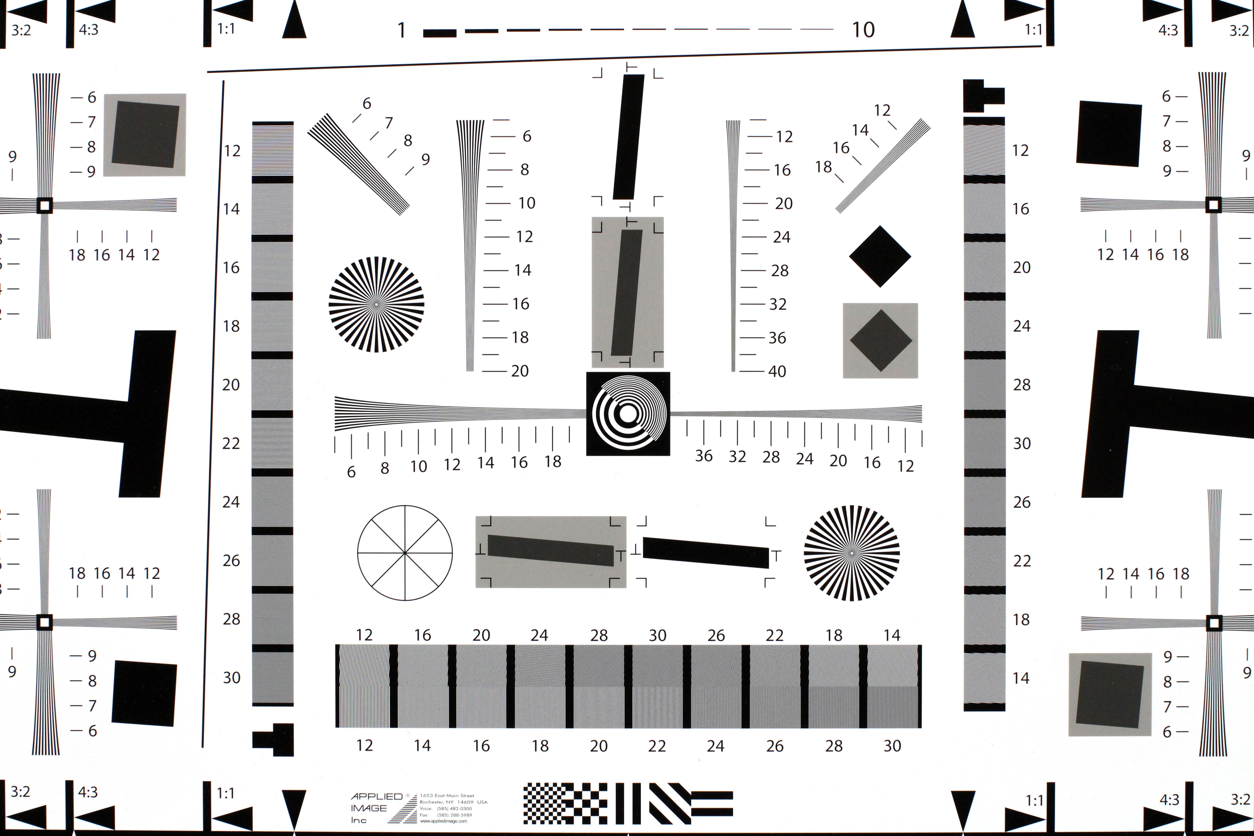 Examining images of the chart taken at each sensitivity setting reveals the following resolution scores in line widths per picture height x100: