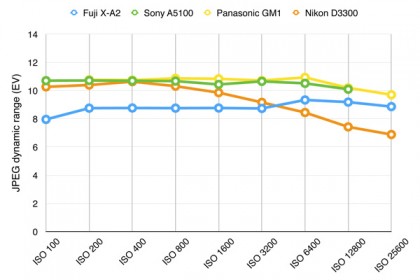 JPEG analysis: The X-A2's JPEGs have a much narrower range of tones than comparable files from the Sony A5100, Panasonic GM1 and Nikon D3300, but we've seen this many times before with Fuji JPEGs, which tend to have stronger mid-tone contrast for a more dynamic appearance.