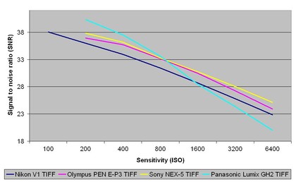 RAW images from the Nikon V1 show results for signal to noise ration are on par with those from the Olympus PEN E-P3, Sony NEX-5 and Panasonic Lumix DMC-GH2.