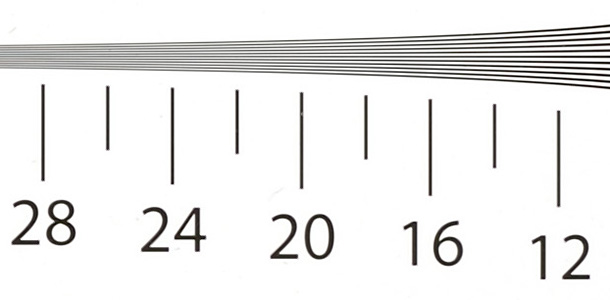 Examining images of the chart taken at each sensitivity setting reveals the following resolution scores in line widths per picture height x100: