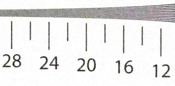 Examining images of the chart taken at each sensitivity setting reveals the following resolution scores in line widths per picture height x100: