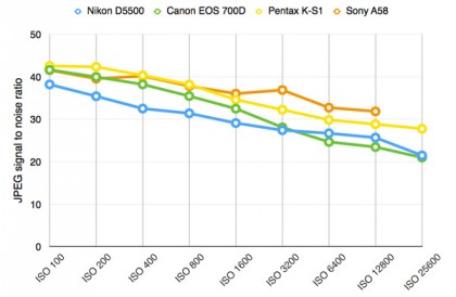 Analysis: There's very little to choose between these four cameras for dynamic range when shooting JPEGs – though the Sony A58 does edge ahead at ISO 3200 and above. For raw files, though, it's a different story. Here, at ISO 800 and above, the D5500 lags slightly behind its rivals. This may make a difference if you're a fan of handheld low light photography and you like to shoot raw.