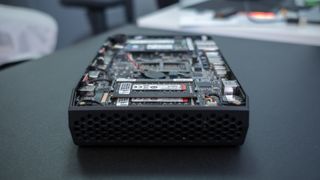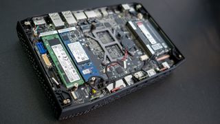 Cracking open the Hades Canyon NUC is a breeze, as it just requires undoing six torx screws and a single Philips head. With the top cover removed, you can access the computer’s memory slots as well as the M.2 NVMe and SATA drives.
