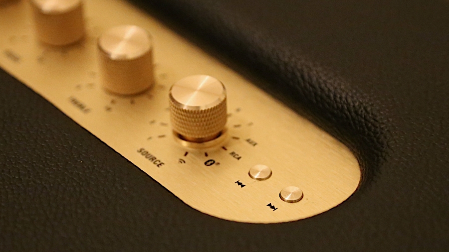 Measuring 400x308x200mm and weighing 7.9kg, the Woburn is adorned by a big brassy Marshall logo and matching beading around the edge of a nicely stitched fabric speaker grille. On the top are some brass knobs for volume, bass, treble, and for selecting the audio source. They allow for some pretty finely-grained tweaks to the soundstage, and nearby are some more manual controls; forward-skip and backwards-skip buttons.
