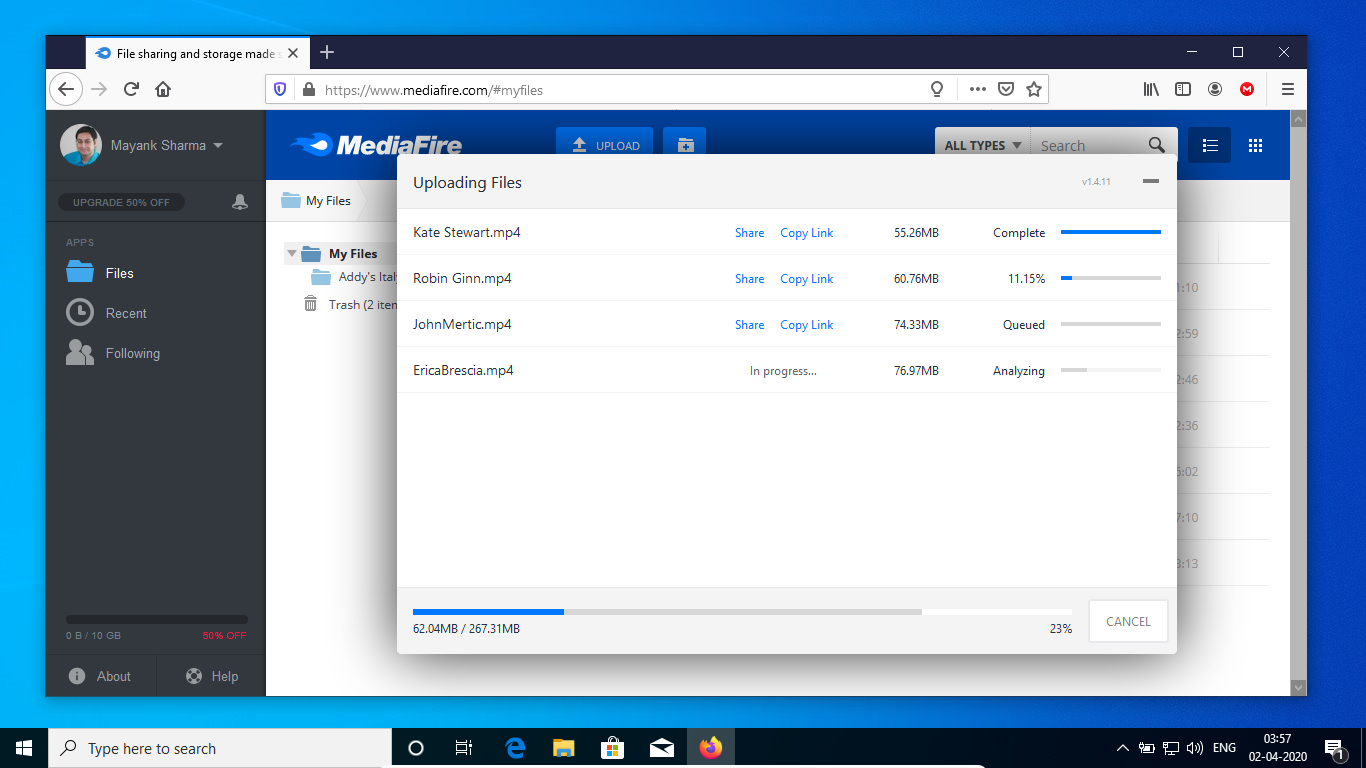 Like its peers, you can use MediaFire to share any file or folder from your account. In fact you get the option to create a share link while you are still uploading the file or folder.