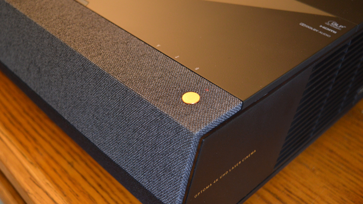 On the front of the projector, you’ll find a gray fabric covering for the speakers, while on the sides you’ll find vents for the built-in fans, along with a HDMI 2.0 port and USB port on the right side for convenience. And, of course, on the top, you’ll get an angled opening for the laser in the projector.