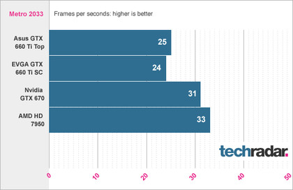 Even the extreme overclock Asus has managed on the GTX 660 Ti GPU, going from 915MHz up to 1,059MHz on the base clock alone, can't help push the performance up to GTX 670 speeds, or even AMD HD 7950 pace.