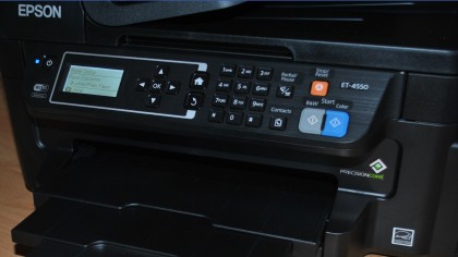 To the right of the extensive 2.2-inch (5.6cm) Mono graphics display are a series of buttons, including a number pad, a direction pad and a start button for both black and color prints. On the far right-hand side of the unit is the bulky compartment where the ink is held. On a typical printer, your ink cartridges are housed within the body of the unit. With the ET-4550 Epson chose function over form by adding a three-inch-wide, four-compartment container to the right-hand side of the unit, into which black, cyan, magenta and yellow ink bottles are poured.