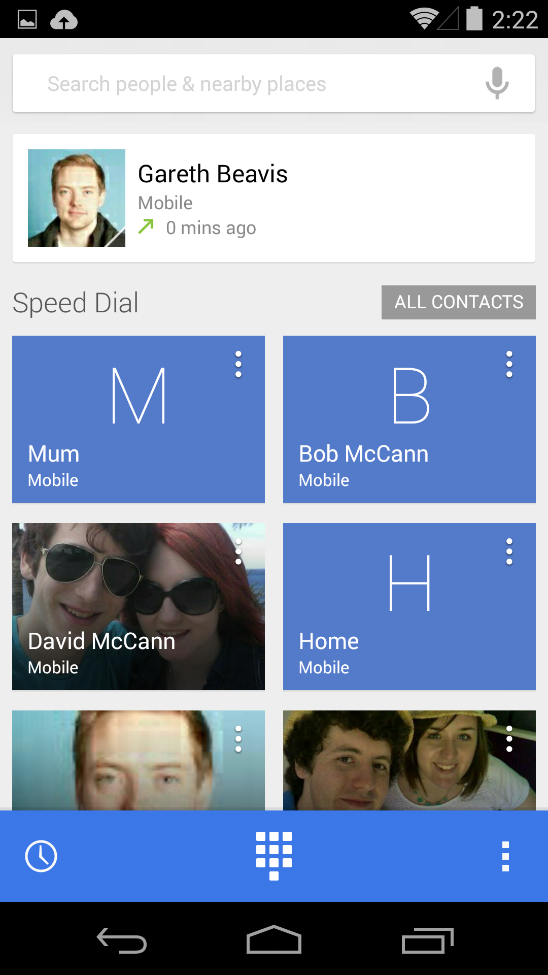 Your last call is highlighted at the top, with three favourites below that, and then the rest of your contact list. It only fills this in as and when you call people.
