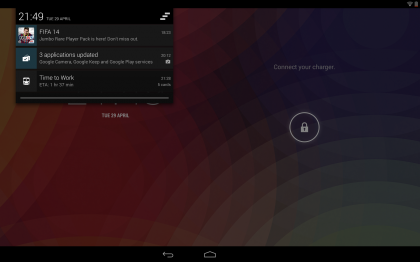 Powering up the Google Nexus 10 sees you greeted by the all-new Android KitKat lockscreen, which features a new Google-colourway touting wallpaper. This can be changed within display settings, however, and another couple have been added to the selection available.