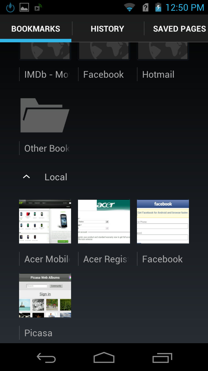 The bookmarks screen displays thumbnails of all your bookmarks, along with your browsing history and any saved pages.