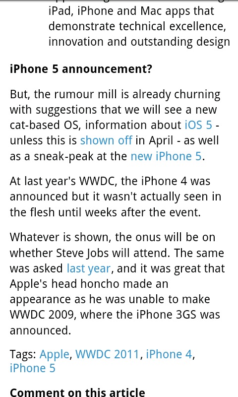 We mentioned in our Google Nexus S review that we wanted text to reflow as you zoomed in, rather than having to tap, and that's what we've got here. As soon as you've finished pinching or doubleop-tapping, the text is reorganised and ready to read.